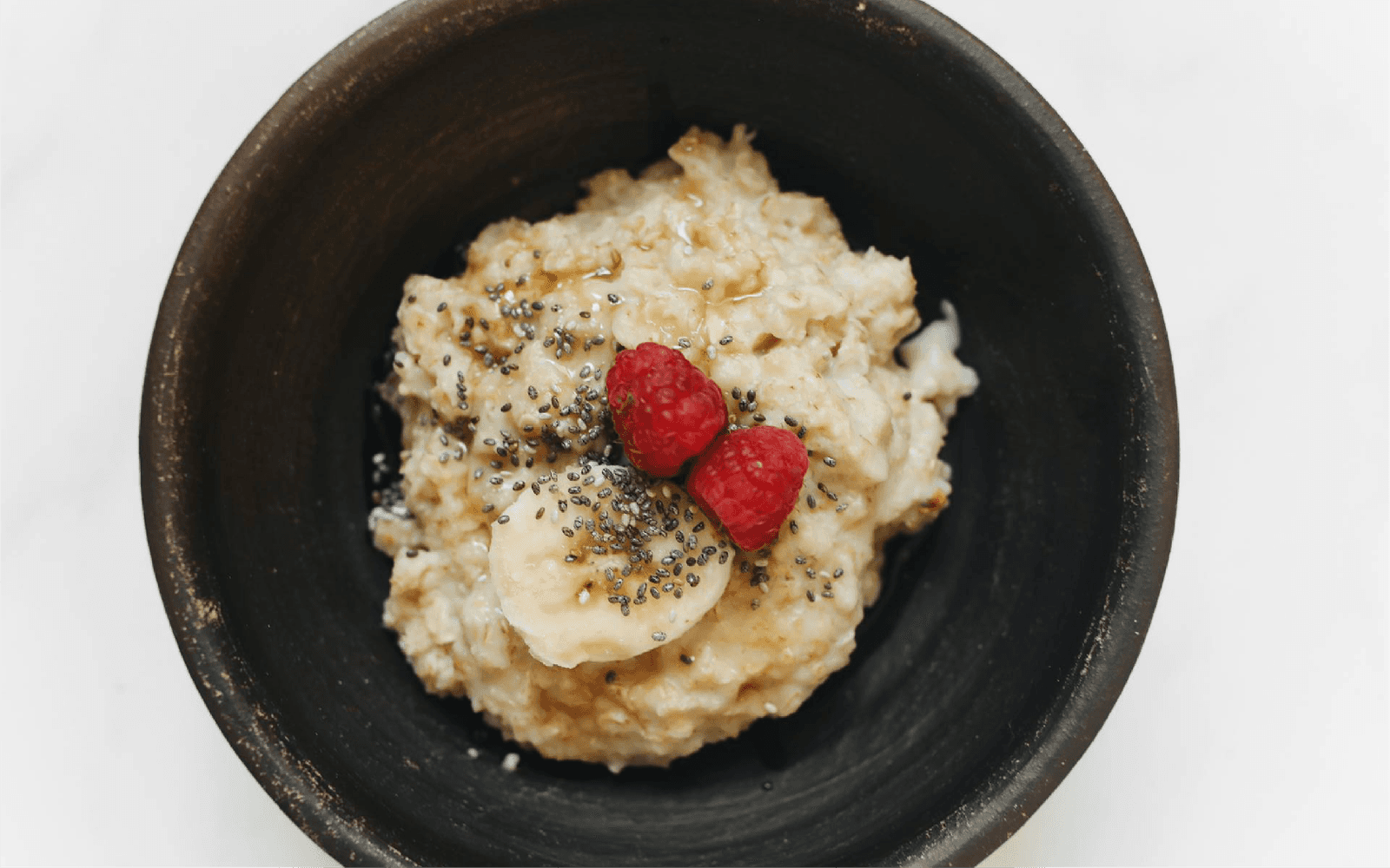Oatmeal with banana slices and chia seeds.