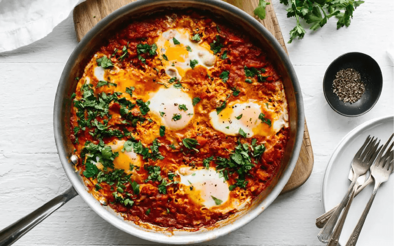 Shakshuka is a popular Middle Eastern dish that’s also enjoyed in the UAE. It’s made by poaching eggs in a spiced tomato sauce. For a healthier version: